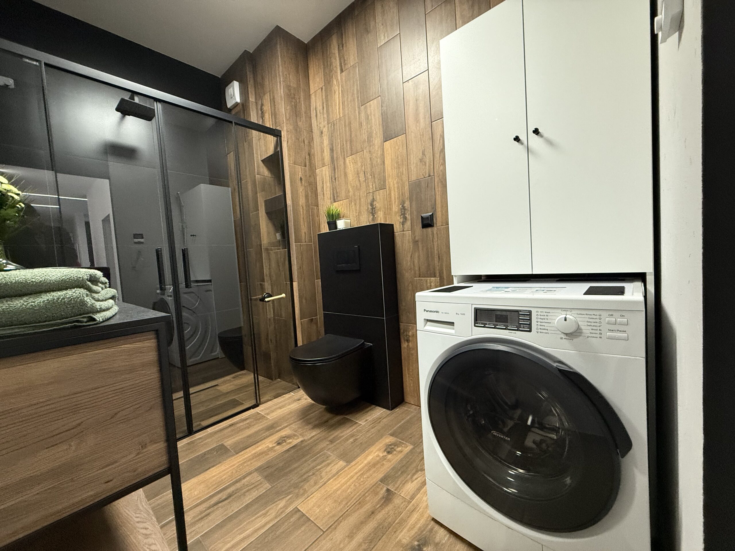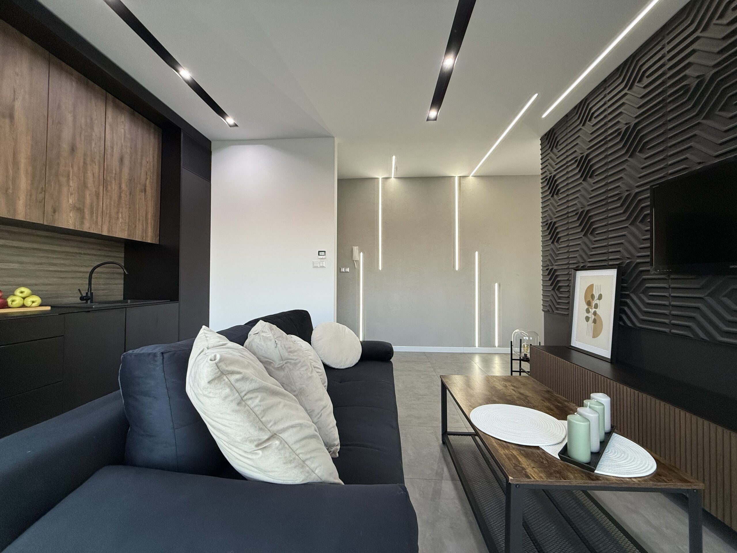 Styl wykończenia nowoczesny, bardzo praktyczny i uniwersalny. Przy projektowaniu zadbano o funkcjonalność, wygospodarowano dużo miejsca do przechowywania. Mieszkanie z wyposażeniem w salonie, kuchni, łazience i przedpokoju. Do uzupełnienia po stornie najemcy sypialnia o własne łóżko z materacem.